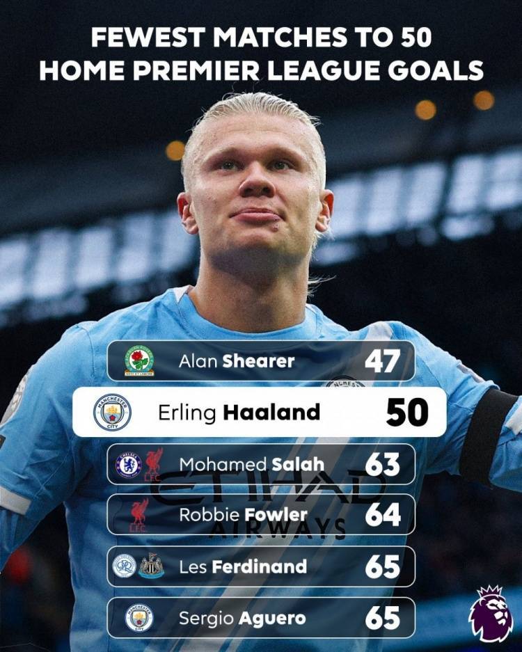 哈兰德50场比赛完成英超主场50球里程碑,效率仅次阿兰-希勒